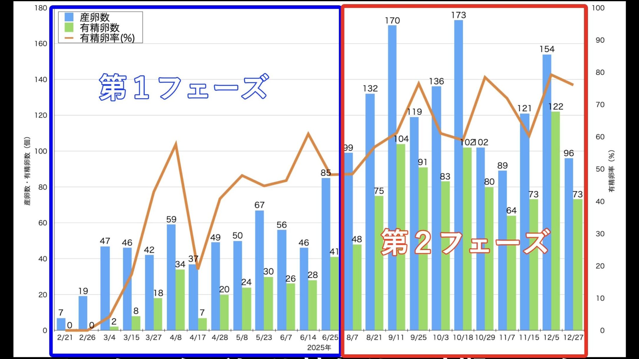 2025年の産卵数・有精卵数・有精卵率をまとめたのが以下のグラフです。